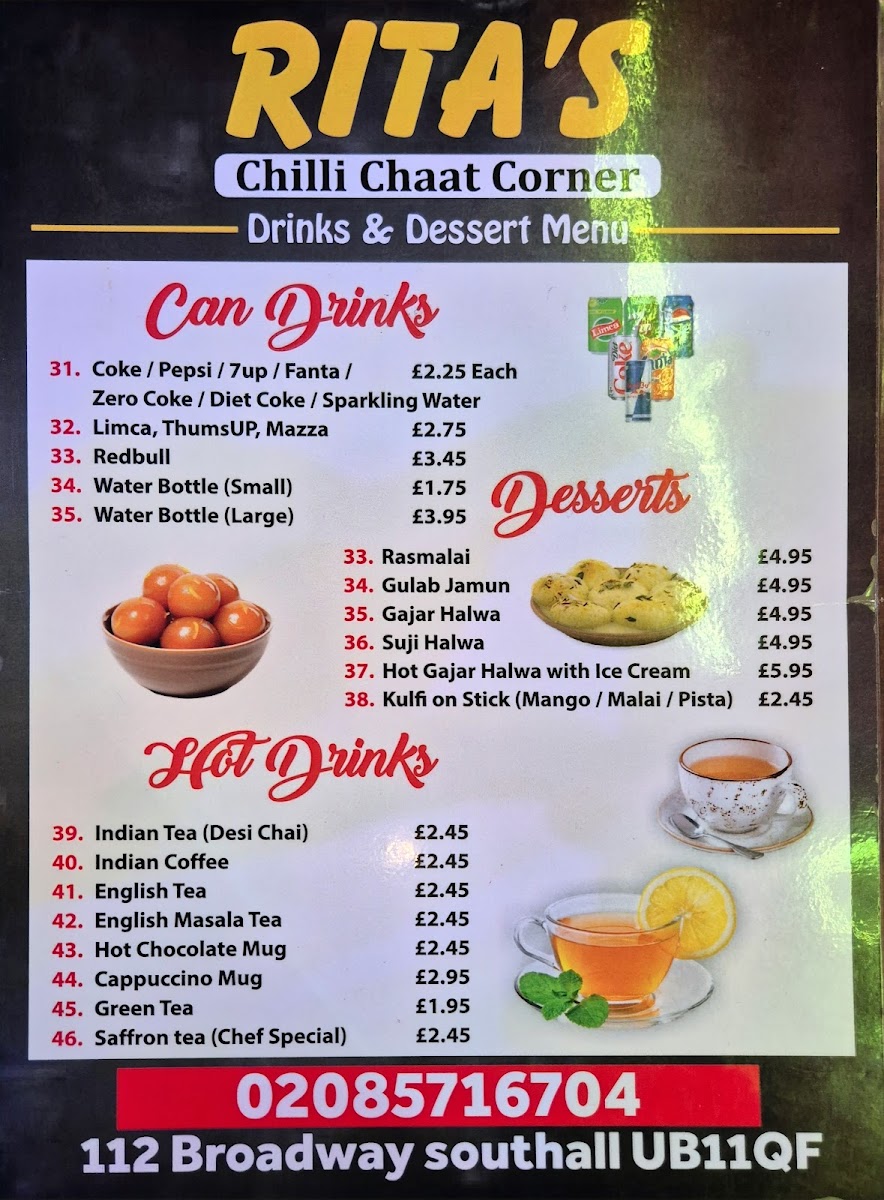 Welcome to Rita's Chilli Chaat Corner, a vibrant gem nestled in Southall that promises an explosion of flavors! This delightful eatery is celebrated for its vast array of chaat and curry dishes that evoke the taste of home. Start your culinary journey with the renowned potato samosas, perfectly paired with a tangy tamarind sauce that loyal patrons can't stop raving about.